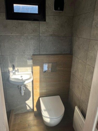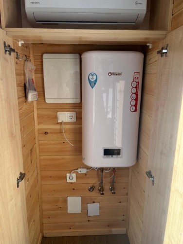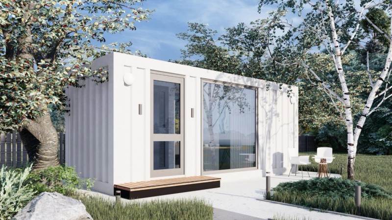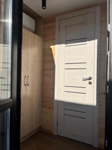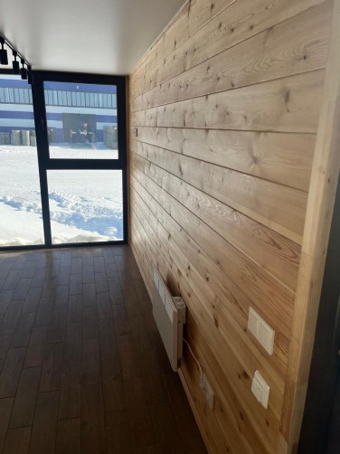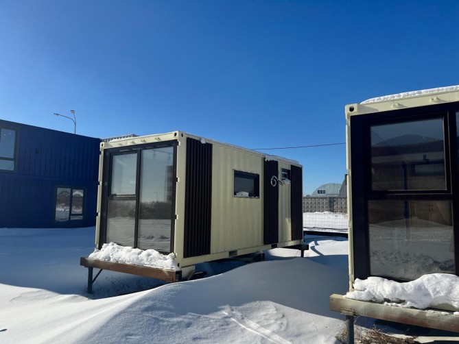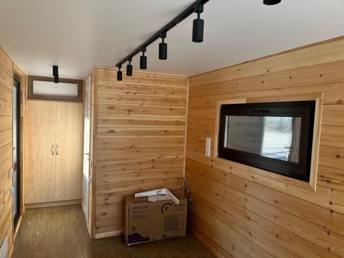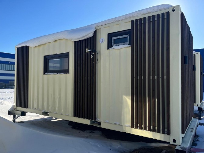 Модульный дом из морского контейнера. Комната-гостинная, отдельный санузел в керамической плитке. Высота потолков 2,1 м.