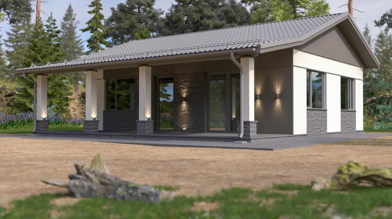 Кровля в варианте проекта 73 м2: кровля 4х скатная с отделкой из металлочерепицы, утеплитель насыпная мин вата, пароизоляция и ветрозащита. Водостоками и снегозадержателями комплектуется по дополнительному соглашению с клиентом. Подшив свесов кровли, осуществляется софитами. Балка муэрлата:100х150 мм, стропила и балки перекрытия 50х200 мм, обрешетка верхняя 32мм (через ряд, в местах повышенного скопления снега у конька и перед свесом обрешетка укладывается сплошным слоем.) Внутренняя обрешетка укладывается через 2 доски с последующим крепление для ГКЛ листов влагостойких.