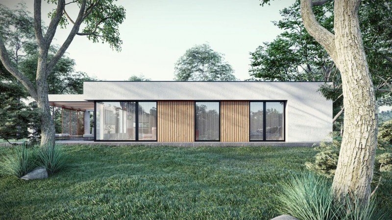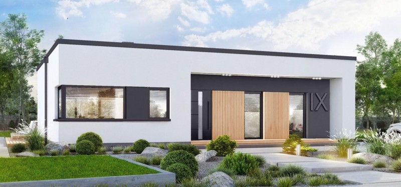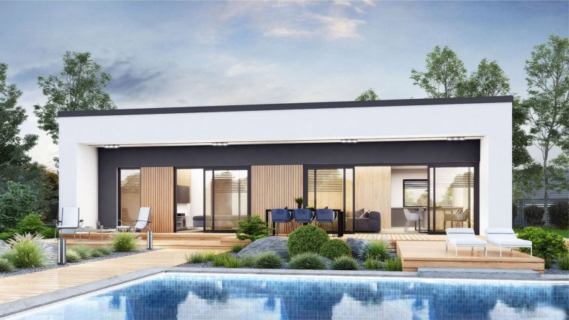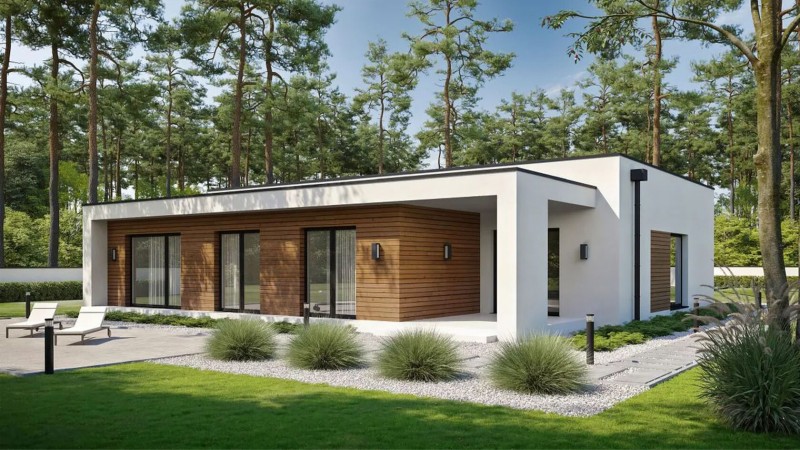 Современный дом с плоской кровлей и крытой террасой.