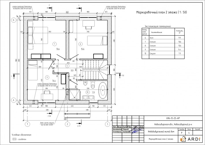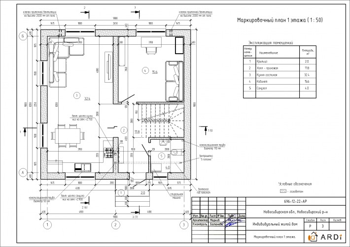 Здание представляет собой двухэтажный жилой дом. В доме запроектированы крыльцо, прихожая, кухня-гостинная, котельная, кабинет, 2 санузла, 3 спальни, холл-прихожая. Кровля дома - двухскатная, с уклоном 30 градусов. Фундамент монолитная ж/б плита.