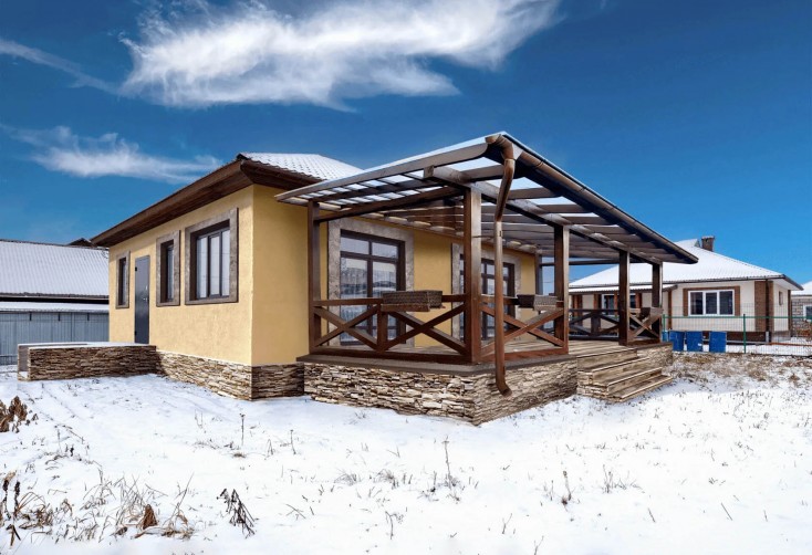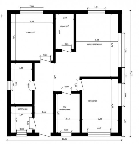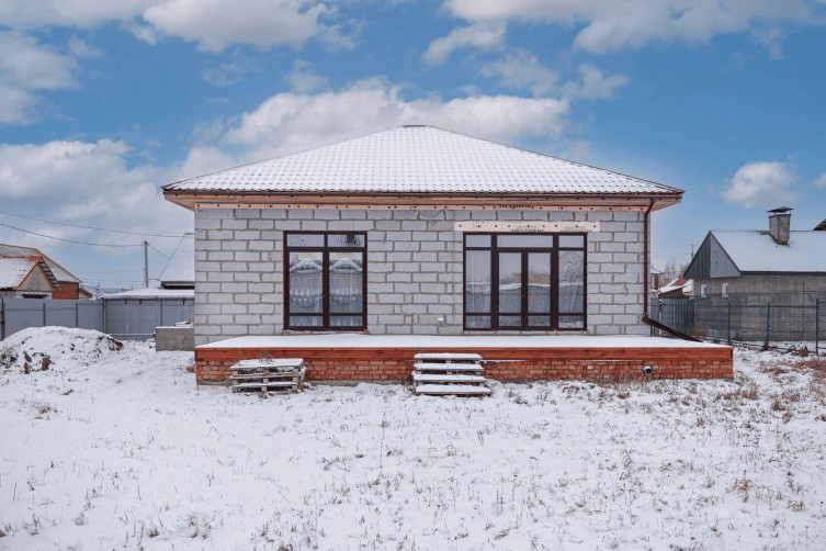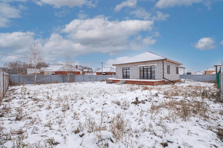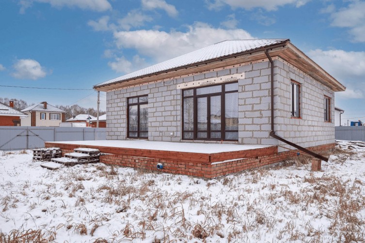 Одноэтажный дом без внешней отделки. Расширенная кухня-гостиная, 2 жилые комнаты, отдельный гардероб и тех помещение.