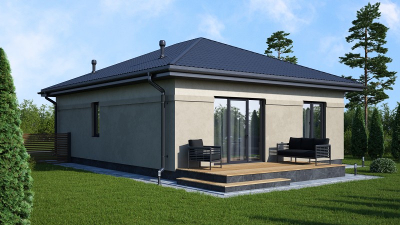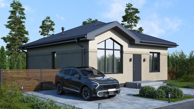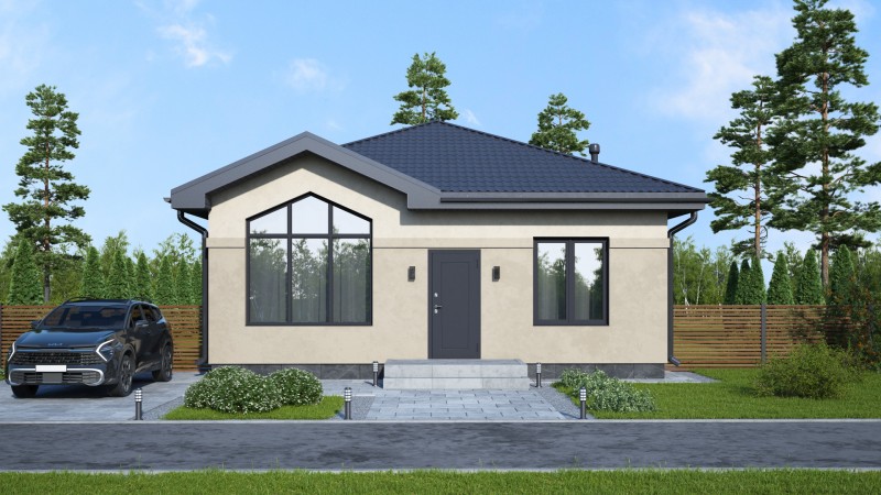 Компактный функциональный одноэтажный дом с оригинальным фасадом и интересной кровлей. Имеет три спальни, кухню гостиную с выходом на задний двор, котельную-постирочную, второй санузел можно разместить в котельной постирочной.