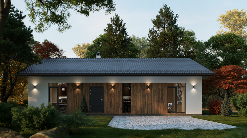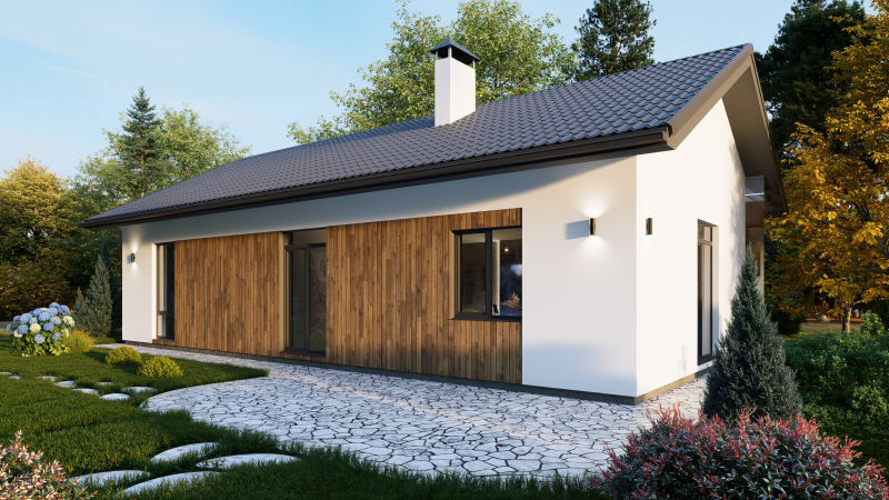 Одноэтажный дом с двускатной крышей, представляет собой классический вариант загородного дома. Двускатная крыша гармонично сочетается с окружающим ландшафтом, а деревянные вставки из лиственницы придают дому эстетичный вид.
