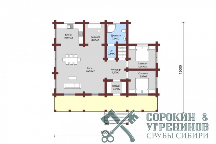 Индивидуальный дом рубленый из лафета кедра сечением 220х350мм, площадь дома 116м2. Размер сруба 12х14 метров. Проект дома планировался с цокольным этажом. Внешний вид дома выполнен в скандинавском стиле с живой кровлей. Дом имеет большой холл, совмещенный с кухней и гостиной, две спальни и санузел, терраса. Отличный дом для любителей норвежского зодчества.