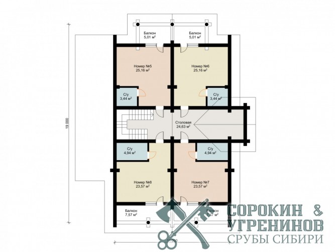 Проект большого гостевого дома из бревна диаметром 300мм, размер сруба по осям 15,3х19мм, общая площадь дома 362м2, объём бревна в срубе 280м3. Большой дом имеет восемь номеров. На первом этаже четыре комнаты с санузлом в каждой, холл, гостиная, два выхода не террасу, котельная, вестибюль, столовая, техническая комната. На втором этаже четыре комнаты, санузел в каждой комнате, и свой выход на балкон.