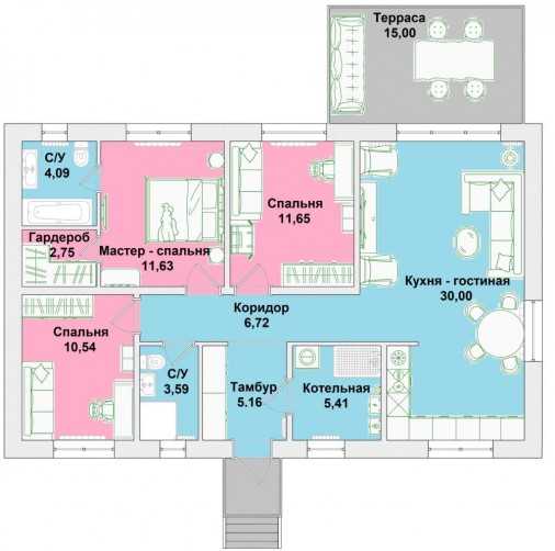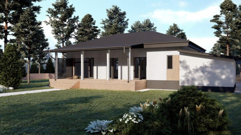 Рады представить нашу новинку — проект одноэтажного дома с мастер — спальней, оборудованной собственным с/у и гардеробной. Отличительной особенностью этого дома также являются французские окна с выходом на террасу из двух спален и кухни — гостиной, имеющей эргономичную форму, позволяющую визуально разделить зоны приготовления пищи, столовой и отдыха. В функциональной котельной помимо инженерного оборудования можно свободно разместить домашнюю прачечную, зону хранения и даже лапомойку для любимых питомцев. Фасад дома может быть выполнен как в классическом кирпиче, так и в штукатурке. Возможна зеркальная планировка. Глухая боковая стена позволяет в дальнейшем пристроить навес для автомобиля или гараж на 1-2 машиноместа.