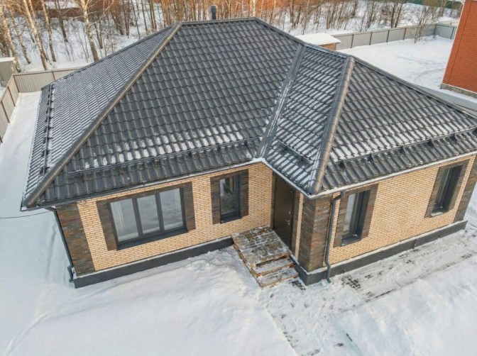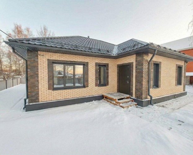 Фасад дома выполнен в классическом стиле с эстетичной облицовкой кирпичом, контрастными углами и аккуратным обрамлением окон, что придает ему особый шарм.