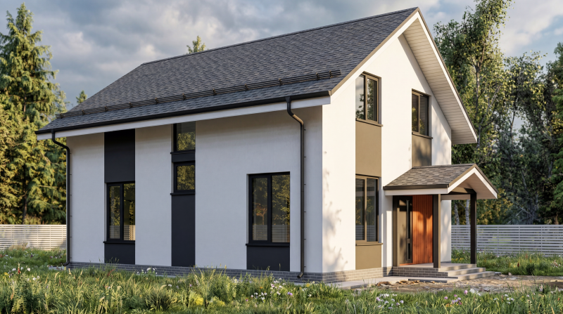 Отделкка фасада - декоративная штукатурка с элементами дерева из планкена