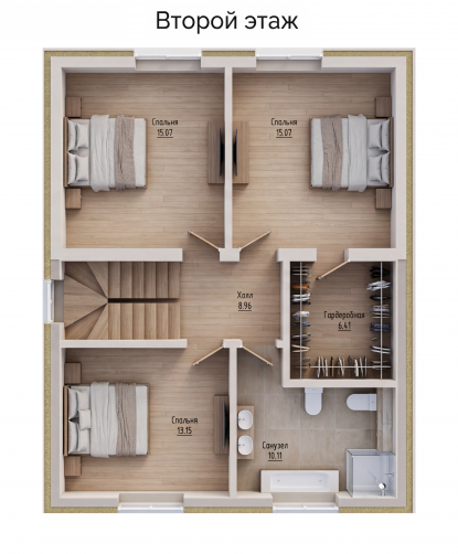 Внутри предусмотрены: котельная, прихожая, холл, 4 спальни, два санузла, гардеробная и кухня-гостиная.