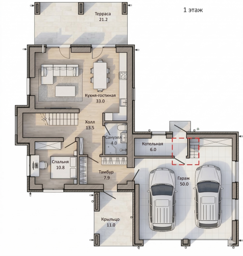 Гараж спроектирован таким образом, чтобы в него вместились два автомобиля и котельная с отдельным входом.