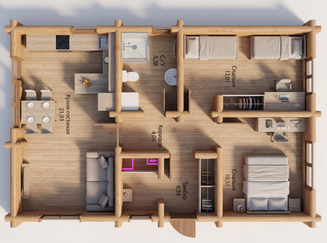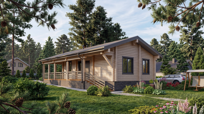 Дом небольшой, поэтому мы особенно внимательно отнеслись к эргономике проекта. В прихожей предусмотрен шкаф для верхней одежды и обуви. В кухне-гостинной есть выход на террасу. Она защищена кровлей, поэтому здесь можно проводить время даже в дождливую погоду.